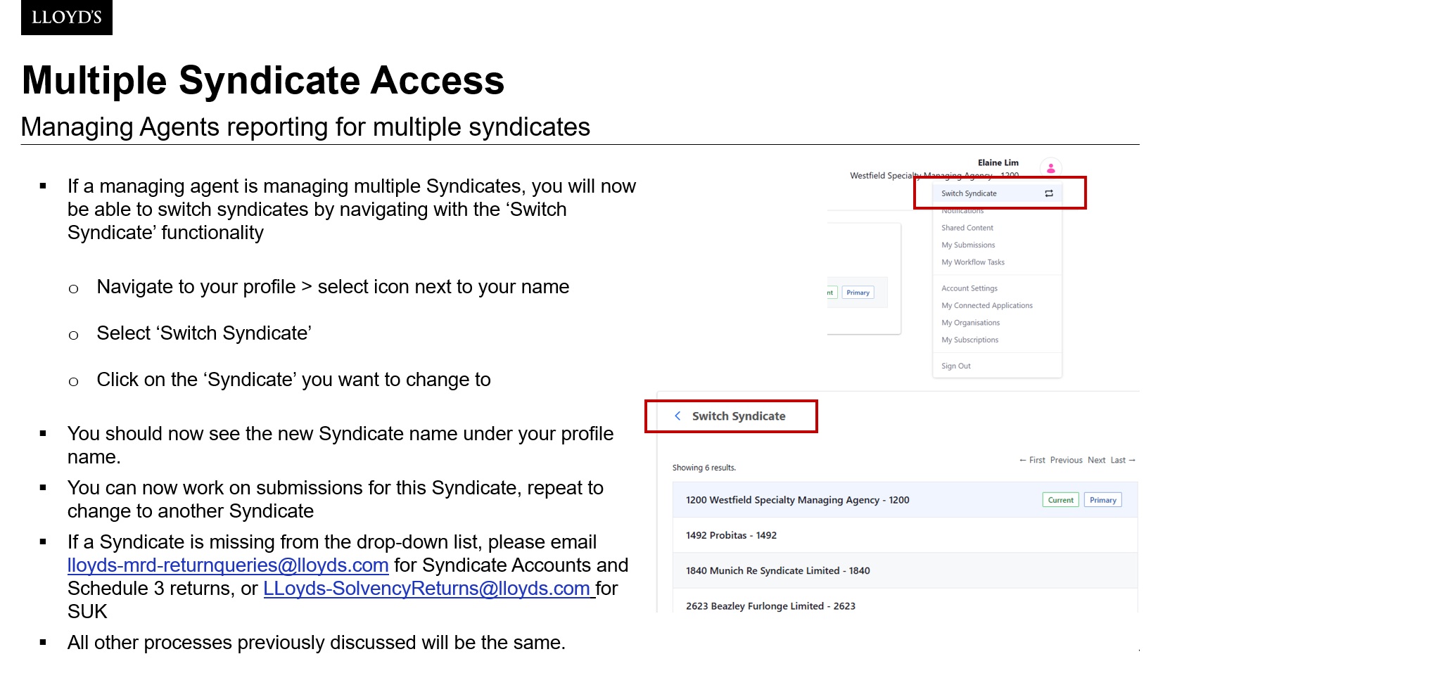 Use "Switch Syndicate" found under the User Profile Icon to view all the Syndicates you have access to